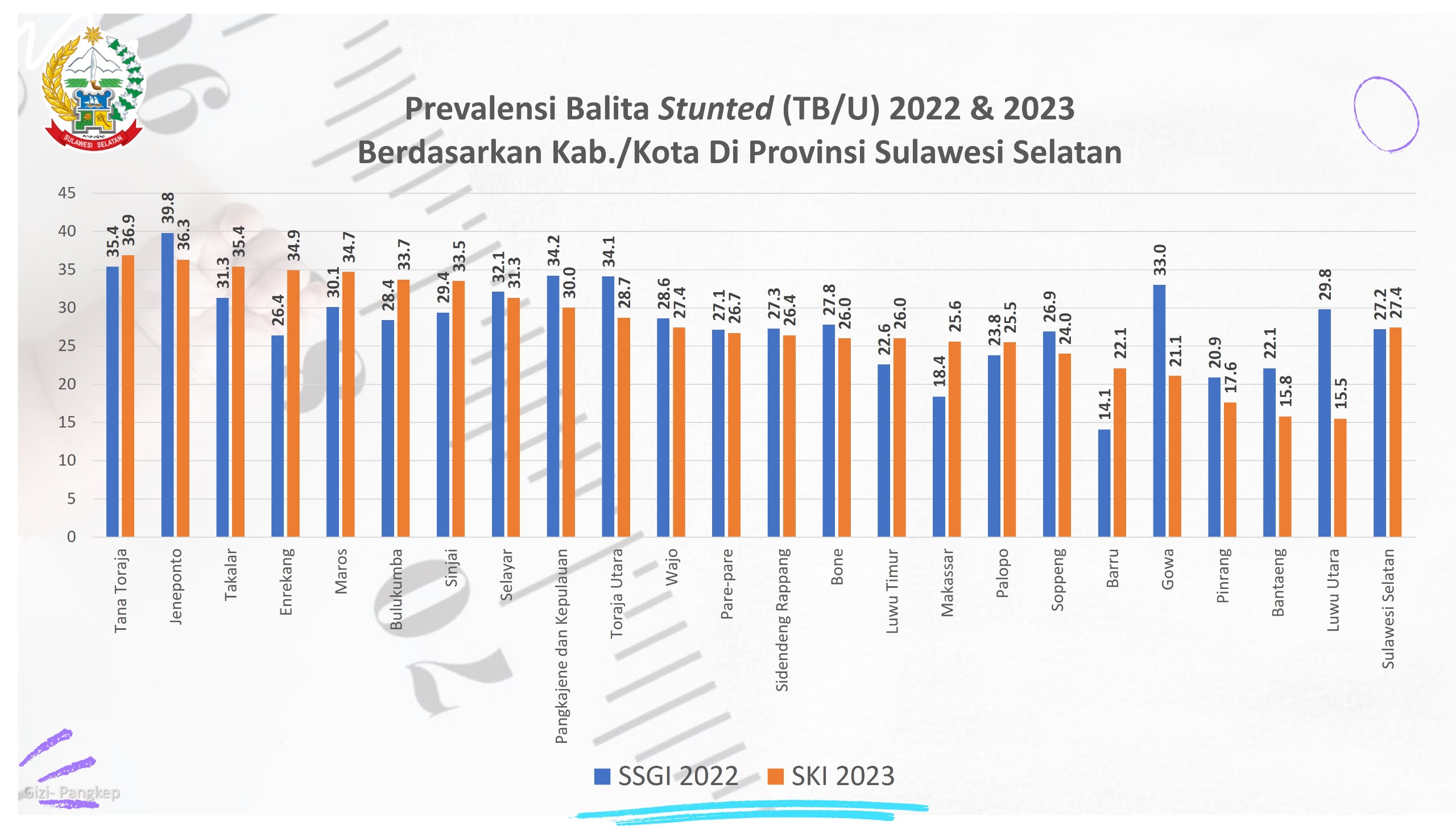 Ironisnya, berdasarkan Survei Kesehatan Indonesia, stunting di Tana Toraja pada tahun 2022 prevalensinya 35,4%, dan naik pada tahun 2023 diangka 36,9 %. Artinya, Kabupaten Tana Toraja tertinggi stunting di Sulawesi Selatan (grafik).